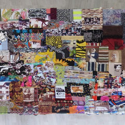 Erinnerungsteppich (300 x 120 cm), Fotografien, Stoffe, CD Player, 2 Lautsprecher, 300 Kommunikationskarten, 40 Folien, Glasbehälter.