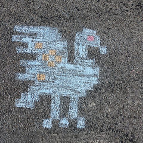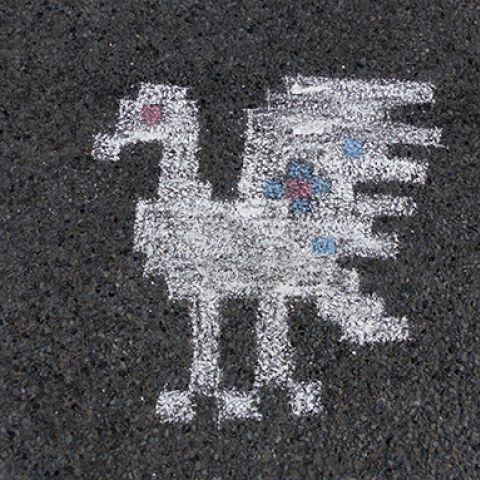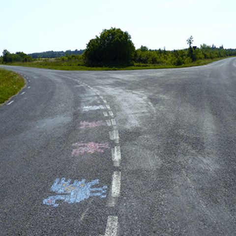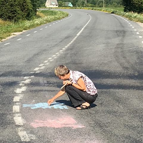 "Birds on the street of Muhu" is a performative artistic work. It is based on a bird ornament from the Estonian folk tradition. At the central intersection of Nommküla I drew bird figures with colored chalk. They disappeared due to the abrasion of the car tires after a few days. What remained was a fragmentary picture, an idea of a drawing.