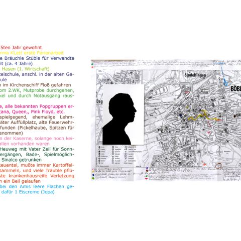 Time Windows / Time Silhouettes is an interdisciplinary cum participatory art project comprising individual cartographically drawn worksheets, photographs, and recorded conversations with city residents. In this approach to cultural identity, Spitzmüller's dialogue with Böblingens elderly community explored places and their associated memories.