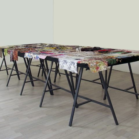 Erinnerungsteppich (300 x 120 cm), Fotografien, Stoffe, CD Player, 2 Lautsprecher, 300 Kommunikationskarten, 40 Folien, Glasbehälter.