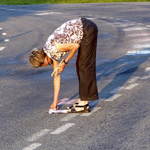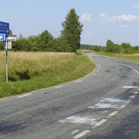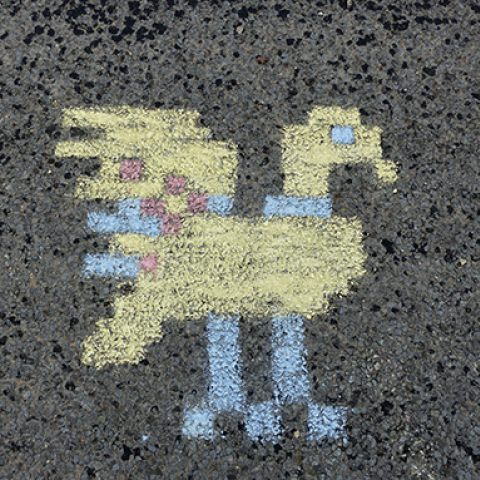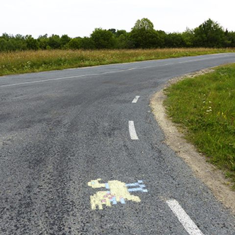 "Birds on the street of Muhu" is a performative artistic work. It is based on a bird ornament from the Estonian folk tradition. At the central intersection of Nommküla I drew bird figures with colored chalk. They disappeared due to the abrasion of the car tires after a few days. What remained was a fragmentary picture, an idea of a drawing.